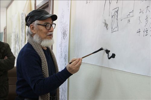 最后,余昌宇让大家一起互动,你一笔,我一墨,共同完成了一幅山水画。