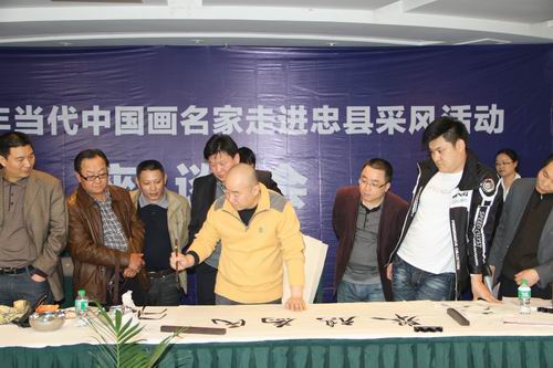 2012年3月31日,北京凤凰岭美术馆中国画名家走进忠县写生采风团画家一行在前往八斗台景区写生后,举行了创作笔会。大家热情高昂,提笔挥毫,现场创作了多幅书法、国画等作品。在宽敞明亮的大厅里,中央文史研究馆馆员、中国国家画院院长名誉院长、中国美术家协会中国画艺委会主任、北京凤凰岭书院导师龙瑞,中国国家画院国画院副院长、北京凤凰岭书院导师范扬,重庆西南大学美术学院教授方方凤富,中央美术学院中国画学院副教授岳黔山,北京凤凰岭美术馆馆长张培武,北京凤凰岭美术馆常务副馆长韩国栋,河南省国画院副院长张宝松,解放军美术创作院委员、国防大学政治部专业美术创作员张立奎,南京信息工程大学传媒与艺术学院院长顾平、信阳师范学院美术学院副院长汪峻岭、北京凤凰岭美术馆驻馆画家张民生、北京美术家协会会员王抗生、北京师范大学艺术与传媒学院教授梁玖等名家现场挥毫泼墨。