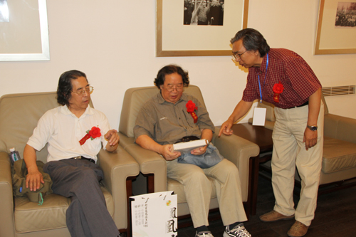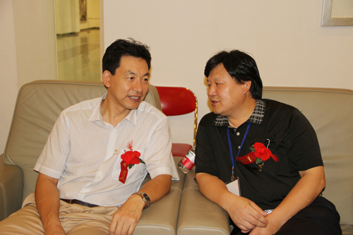 北京凤凰岭美术馆董事长、北京凤凰岭书院名誉院长张红军与国家粮食局流通与科技发展司副司长唐柏飞先生交谈