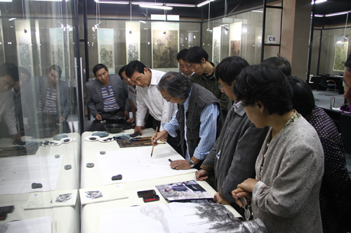 张馆长一一点评每位学员的临摹作品,指出存在的问题,纠正了学员们错误的临摹方法,强调树、山石的画法,以及皴擦点染的技法要领,并亲笔示范,让学员们直观地感受怎样去临摹。张馆长告诉大家,一定要静下心来,从一棵树、一方石画起,不要急躁,不要急于完成一幅作品,而是体会正确的临摹方法,扎实基础。