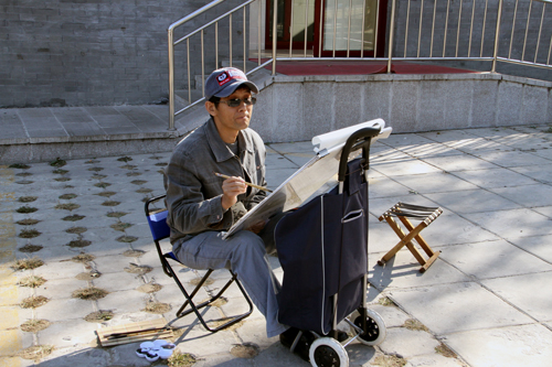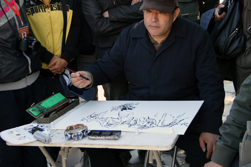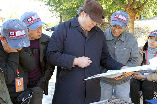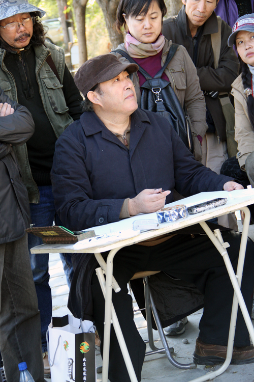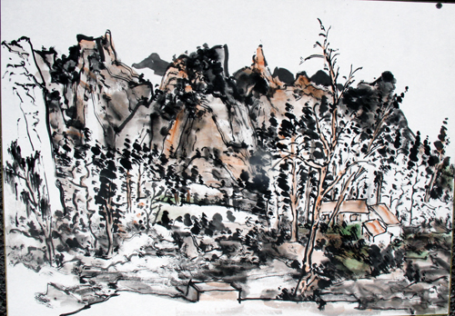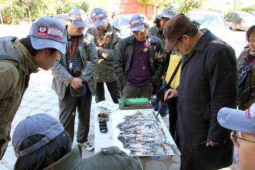 韩国栋在凤凰岭脚下示范写生,说:“大家先观察景致,选取合适部分或局部作为被画对象,仔细观察、思考,适当地取舍。物象的形态要用笔墨表现,达到物象就是笔墨,笔墨就是物象的境界。如果你把景物原封原本地画下来,还不如直接用照片的形式表现出来。写生并不是一定要画得形象逼真,应介于似与不似之间,重在作品的现场感。别人看山就是山,画家眼中的山应是笔墨线条。大家不要怕画得不好或不知怎么画,笔要放得开收得住,不要拘谨,只有不断地画、大胆地画,我们才能逐渐发现存在的问题,才能找到解决问题的方法,从而不断地提高。”