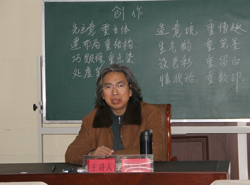 张培武馆长把自己几十年来的创作经验概括为“先立意、建布局、巧皴擦”等八个方面,分别为学员做了详尽讲解。他讲到,用笔用墨要一气合成的天趣,讲究皴法,讲究阴阳顿错,讲究一波三折的韵味,远看其势,近观其质,并亲自示范讲解各种图式、山石结构和皴法,学员受益匪浅。