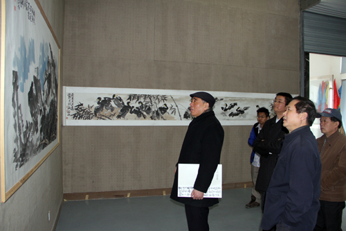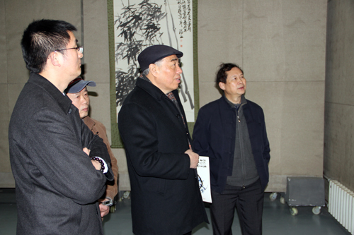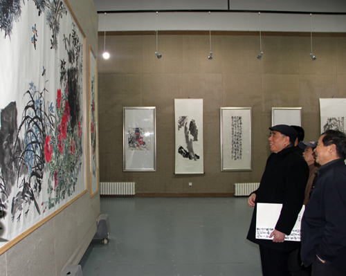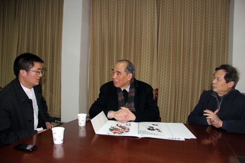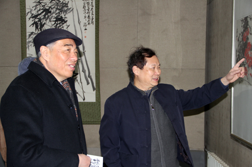 2013年4月1日,古文字学家、书法教育家、文化学者卜希暘先生在《水墨味》总编辑项堃的陪同下顶风而来观看【凤鸣在岭】大块文章·汤立大写意花鸟画展。