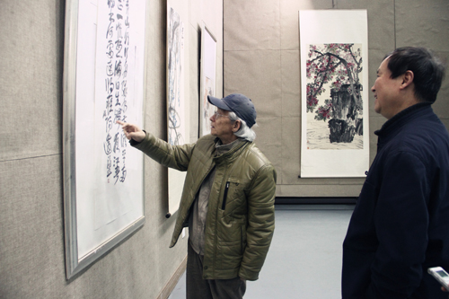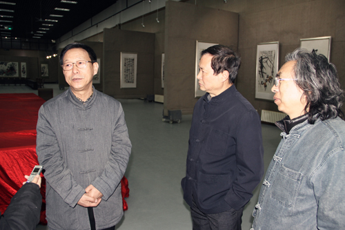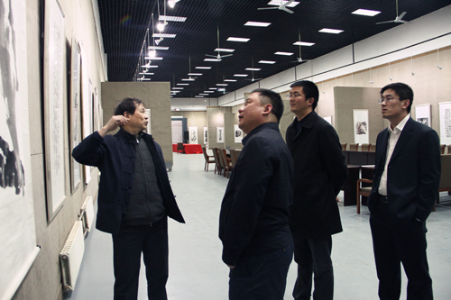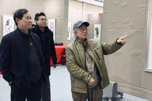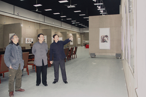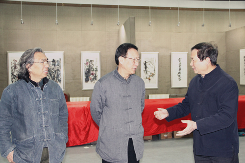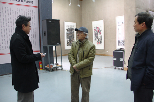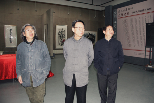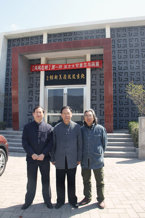 2013年4月8日上午,中国国家国史馆特约研究馆员、中国艺术研究院特约研究员、画家吴悦石先生在北京凤凰岭美术馆馆长张培武和此次专题展画家汤立的陪同下观摩【凤鸣在岭】大块文章·汤立大写意花鸟画展。