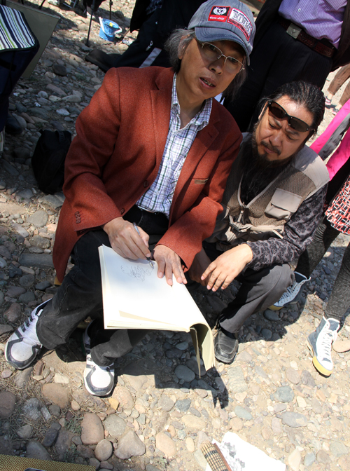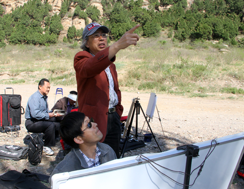 青山绿水,一山环抱着一山,一条小河萦绕其间。山石结构纹理清晰了然,花草树木各具其势,正是学员们写生的最佳地理位置。课题班执行导师张培武根据每个人的情况,做出了合理的安排,有的进行山石结构的强化,有的加强树草的造型,有的感受画面构成及布局。张培武先生在写生过程中,还不断地停笔查看学员们的写生,并适时作出指导与修正。