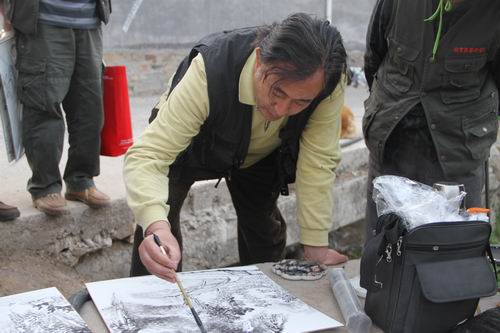 中午时分到达云蒙山,感觉一下子从喧嚣的城市来到了宁静、安详、与世无争的世外桃源,这深深的吸引了艺术家们。韩国栋说到:“这里真是个写生的好去处,山石纹理结构复杂,山体错落有致,非常适合山水画的写生;山里人的淳朴、善良、厚道也适合人物画;春暖花开,鸟语花香,更是花鸟画的理想之处。希望大家在保证安全的同时,通过对大自然的直观感受,提升对中国画笔墨、图式及境界的认识”。