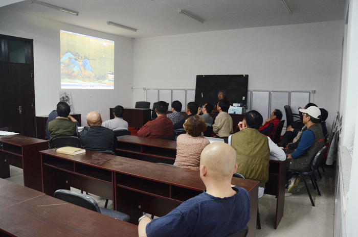 接下来,张培武先生以王希孟的《千里江山图》为例,从构图、布局、颜色等方面作了详细的解说,并对图中巧妙地细节安排作了重点说明,并告诫大家要学会并慎重对待细节方面的处理。