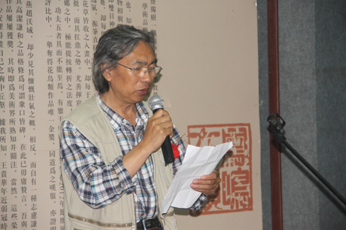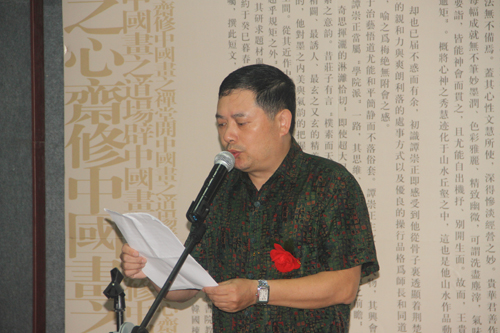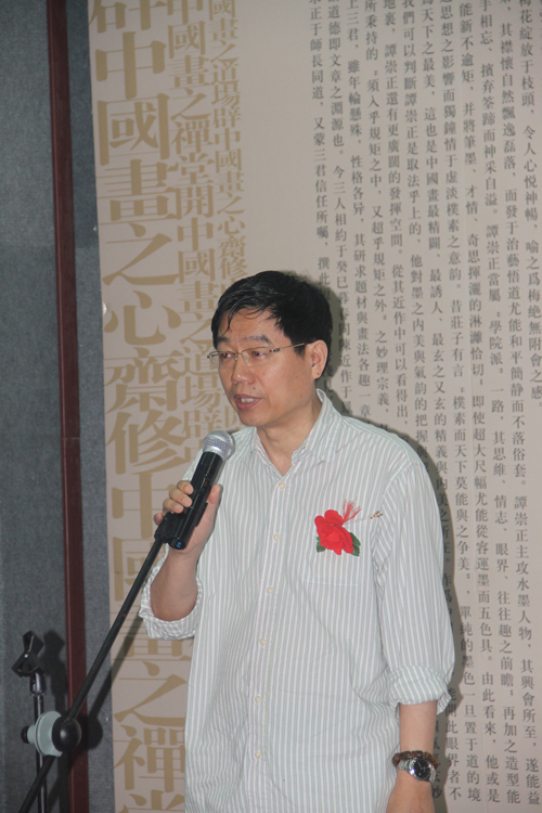 北京凤凰岭美术馆馆长,北京凤凰岭书院院长助理张培武发言:“余昌宇、王贵华、谭崇正三位画家求学于北京凤凰岭书院,作为凤凰岭书院中国书画学精英班学员的代表,他们展示了自己的中国画作品,正是凤凰岭书院教学成果的缩影,同时也再次证明了书院以师傅带徒弟式的传统美术教学模式的成功性。北京凤凰岭书院自开办以来,受到社会各界和中国画学界的高度赞赏与瞩目,2012年中央文史馆专程到凤凰岭书院和凤凰岭美术馆进行调研,专家学者对凤凰岭书院独特的教学理念和模式给予了高度评价。