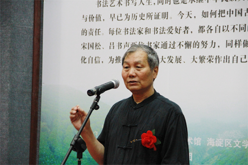 中国书法家协会副主席李刚田致辞:“书为心画,字如其人。书法对人格的培养和历练有着极其特殊的作用。我们高兴地看到,国家越来越重视书法的教育,2012年教育部门制定的中小学新课程标准增设书法课,这对于像宋国松、吕书声以及包括本人在内的书法创作者来说,都是一件非常值得欣慰的大事。这也意味着我们所肩负的书法艺术的传承责任之重大。北京凤凰岭美术馆、凤凰岭书院作为一家民营艺术机构,始终秉承着弘扬民族传统的宗旨,为传承中国民族文化和艺术做着不懈的努力与贡献。在此,我希望宋国松、吕书声两位书家和我们大家一起共同肩负起这一文化重任。”