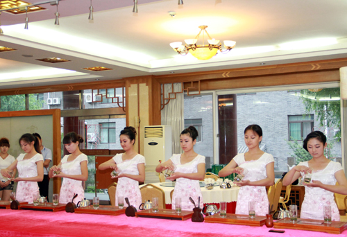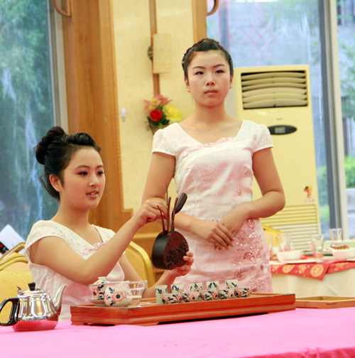 北京凤凰岭书院书法家刘志强、凤凰岭美术馆理论部主任褚哲轮,现场挥毫,淋漓尽致地展现了中国书法的独特魅力。信阳龙渚春茶业公司的茶艺师们在古色古香的琴音中表演茶艺,飘起了浓浓的茶香,在场的嘉宾一起品尝香茗,并感受来自河南信阳的茶文化。