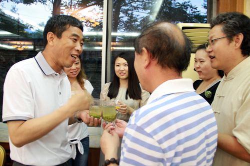 信阳龙渚春茶业公司董事长张新华与北京凤凰岭美术馆职员举杯共饮