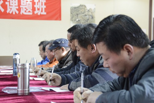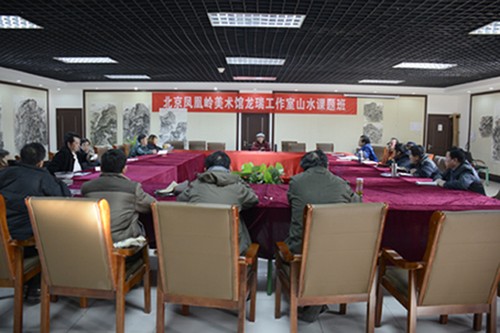 2013年12月5日下午,北京凤凰岭美术馆龙瑞山水画课题班在张培武老师主持下召开了一场别开生面的班会。张老师首先回顾了昨天座谈会的情景,畅谈了自己的感受,他说:昨天的会议是一次非常成功的当代山水画课题研究座谈会,在当下浮躁的今天,能有一批画家在这个偏僻的地方静心创作并且能够有这么多的名家为其指明方向、提出不足、探讨课题,尤为可贵。针对导师们提出的问题,张老师总结了构图、虚实、书法、题款、细节、留白等十五个方面今后需要提高与改进的地方,再次强调了中国画求正、求实、不求快、以质取胜的理念,要求我们潜心修行、淡薄名利。