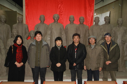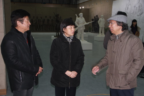 最后,杨承志主席一行来到美术馆展厅参观了王洪亮教授的雕塑作品,并对王洪亮教授的雕塑作品给予了高度评价。杨主席讲到:“王洪亮教授的雕塑作品雄浑朴拙,大气磅礴,重现了中国红色革命的历史,极有教育意义”。