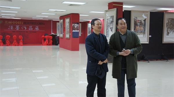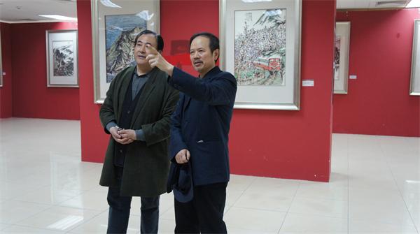 在韩国栋先生的陪同下,田黎明先生非常认真、投入的观看了每一幅作品并评价道:“国栋将祖国河山尽收五指,此次展出的山水画作品构思巧妙,扎实耐看,空白虚实处理妙趣横生,令人玩味不止。每幅作品以墨为主,颜色辅助,但是墨的分寸把握的恰到好处,有厚重感,并将地域特征风貌与高妙的指墨技法与表现方式结合起来,达到了一个很高的境界,这无疑开创了山水画的一个新的格局与气象,非常难得”。
