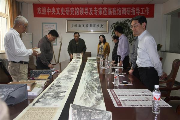 北京凤凰岭美术馆馆长韩国栋向厦门商务局副局长兼会展局局长王琼文一行介绍长卷创作情况