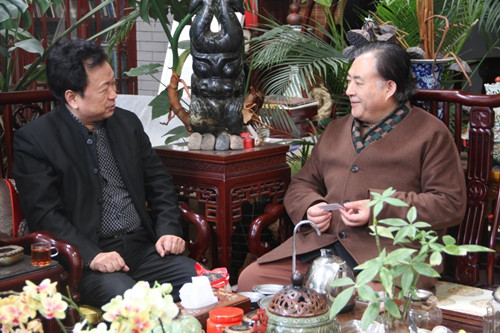 春日融融,鲜花怒放,在翠竹掩映中,谭友鹏先生一行来到韩馆长的工作室,韩国栋馆长与谭友鹏先生亲切握手并礼让落座,大家品茗谈艺,互通挚情。大家观赏了韩馆长创作室四壁上的画作,被韩馆长精湛的指墨艺术作品所折服。韩国栋馆长向各位来宾介绍了北京凤凰岭美术馆的概况及近几年取得的成果。谭友鹏先生对北京凤凰岭美术馆幽雅的自然环境、先进的管理模式、纯粹的教育理念表示赞赏。