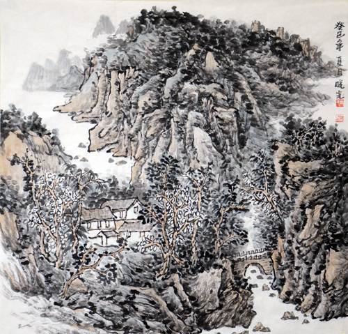 对景写生,是每位画家必休之课,面对真山真水,是把自己在画室里没有解决或没来得及解决的问题,在现场通过对景写生逐渐的解决,大自然之中气象万千,千姿百态,山川河流,古迹茅舍,庭院小桥,丛林杂树等这些物象和结构是画家在画室里编不出来的,就是编出来那也不生动,是没有生活情趣的,所以只有到大自然中去观察,去发现,去表达。这次到云蒙山写生,看到忽高忽底的树木,奇形怪状的石块,苍苍莽莽的山峦,清澈的流水,散落的村舍,常常使人流连忘返,而我需要将此记录下来,挥笔对景感悟,就按老师所教的“一看、二坐、三品、四动”的步骤,反复细致的研究山石的结构与走势,谁前、谁后、谁主、谁次、谁浓、谁淡都要细细的揣摩,虽然这次写生还有很多的东西要提高。但这需要一个过程,这个过程往往是由浅入深,由传统而自我,在临摹中感悟古人,在写生中发现自我。