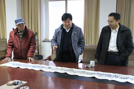 这次倪先生专程来访,是因为我馆今年为西安电子科技大学建校八十周年而创作的中国人物画巨幅长卷——《西电浩歌》而来,作为这所母校的学子,他表达了慰问和感激之情。畅谈中,他深切回忆起大学时代的青春岁月。倪先生的丰厚学养、广博知识和远大胸襟令人敬佩。交流的氛围十分热烈,对他的来访,张董事长代表美术馆表示了热烈的欢迎。