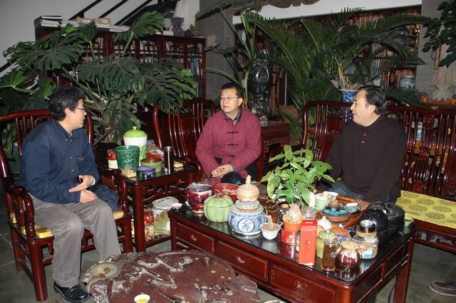 (左)北京凤凰岭美术馆理论研究部主任、《凤凰美术》执行总编褚哲轮,(中)北京凤凰岭书院导师曾来德,(右)北京凤凰岭美术馆常务副馆长韩国栋在交谈